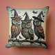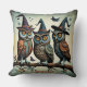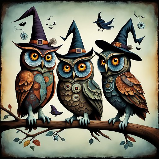 Scary but cute. A trio of owls wearing witch's hats; surreal style, an artificial-intelligence generated artwork on a tote suitable for carrying many things, but especially the trick-or-treat loot.