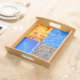 This is a well made, sturdy wooden tray with a flawless black finish and lovely map on the tray surface. It is both vintage & modern at the same time. Looks exactly like the photo; does not disappoint. So nice to find something of quality individually made and not the mass-produced 'shabby chic' merchandise seen in stores. I am so pleased to be able to give this to my college-age niece for her birthday. This can be used as a tray to hold jewelry or toiletries, or hung on the wall as art. The map surface is sealed (it is slightly shiny) so would be moisture resistant. It is well worth the asking price but I was able to apply a sale code as well. Very happy with my purchase. Map is crisp & clear and sealed with a water-resitant finish.