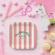 Elevate your 50th birthday celebration with The Fifty Club Pink Cabana Stripe Party Paper Plates, featuring green retro lettering set against chic peach cabana stripes, these customizable plates are perfect for elevating your 50th birthday decor, adding a fun, coastal vibe these plates can be fully personalized with your custom date and destination. Whether you're hosting a beach bash, poolside gathering, or chic destination party, these paper plates bring personality and charm to every table.