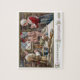 A Pilgrim man and woman and a Native American stand around the dinner table in a log cabin in this vintage Thanksgiving postcard from 1912.