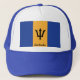 The national flag of Barbados was officially adopted on 30 November 1966, the island's first Independence Day. It consists of a triband of two bands of ultramarine separated by a golden middle band. A black trident-head (commonly called the "broken trident") is centred within the golden band. The flag was designed by local art teacher Grantley Prescod, and was chosen from around 1000 designs after an island-wide contest. The two blue bands are said to stand for the ocean, while the gold is for the sand on the island. The trident is taken from the old colonial badge, which showed Britannia holding a trident, the broken lower part symbolizes a symbolic break with its historical and constitutional ties as a former colony.[1] The three points of the trident represent the three principles of democracy - government of, for, and by the people.