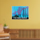 A restored version of the Forth Road Bridge poster. A colorful vintage train travel poster showing the bridge in twilight with passenger car lights visible crossing the bridge.