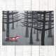 A wild red fox stands among trees in a dark forest. A landscape painting for animal, nature and wildlife lovers.
