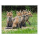 Four red fox kits are pictured with three gazing off at something and the fourth staring straight at the viewer.