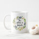 Inspiring mug design for women who change the world features the quote "the future is female" in brush script lettering, inscribed inside a watercolor floral wreath in blue, ivory and green.