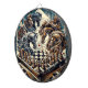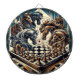 The design depicts a fascinating and imaginative chess scene in which horses with impressive manes and detailed armor are gathered over a chess board. The horses appear to be strategically involved in the game of chess, creating a strong symbolic connection to the knight in the game of chess. The style is a mix of vintage engraving and modern illustration with dynamic lines and dramatic coloring in shades of blue, gold and brown. The design conveys a mystical and strategic atmosphere, perfect for chess lovers and fantasy enthusiasts.