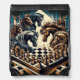 The design depicts a fascinating and imaginative chess scene in which horses with impressive manes and detailed armor are gathered over a chess board. The horses appear to be strategically involved in the game of chess, creating a strong symbolic connection to the knight in the game of chess. The style is a mix of vintage engraving and modern illustration with dynamic lines and dramatic coloring in shades of blue, gold and brown. The design conveys a mystical and strategic atmosphere, perfect for chess lovers and fantasy enthusiasts.