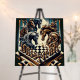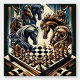The design depicts a fascinating and imaginative chess scene in which horses with impressive manes and detailed armor are gathered over a chess board. The horses appear to be strategically involved in the game of chess, creating a strong symbolic connection to the knight in the game of chess. The style is a mix of vintage engraving and modern illustration with dynamic lines and dramatic coloring in shades of blue, gold and brown. The design conveys a mystical and strategic atmosphere, perfect for chess lovers and fantasy enthusiasts.