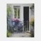 A bicycle stands near the door of a house in a summer garden. The bike is a simple, model with a basket on the front. The basket is filled with flowers, which are in full bloom. They create a beautiful and colorful display.