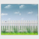 This serene garden under a blue sky with fluffy white clouds, green grass and a butterfly resting on a white fence is certainly a beautiful sight!