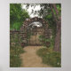 A winding path leads through an ornate wrought iron gate into a hidden garden and cozy home beyond in this original 3D digital artwork, created in Vue D'Esprit by artist Jayne Wilson