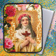 Saint Rose of Lima is surrounded by an arrangement of beautiful, colorful flowers and ornate scroll work. A background of yellow brocade compliments the elaborate illustration collage.
