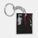 A masked skull worn with a black hooded cape and a black gloved hand inviting you to come. A maroon curtain is used as a backdrop in this photo. This is available on assorted styles and sizes of keychains.