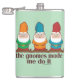 The Gnomes made me do it. 3 different colored gnomes hanging out. Parody / spoof of The devil made me do it. 3 gnome images. Green / Turquoise Background.