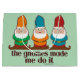 The Gnomes made me do it. 3 different colored gnomes hanging out. Parody / spoof of The devil made me do it. 3 gnome images. Green / Turquoise background. Fully customizable.