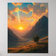 Anime Style scenery with a breathtaking sunset over a mountain valley. The sky is ablaze with vibrant hues of orange, yellow, and pink, with fluffy clouds casting long shadows across the landscape. A single tree stands tall on a grassy hillside, silhouetted against the glowing horizon. A winding river meanders through the valley, reflecting the warm light of the setting sun. It can be gifted to friends and family who loves serene scenery