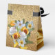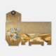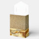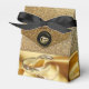 A luxurious shimmering gold silk texture draped through two wedding rings on a dramatic black background with a Deco style stripe to give the design a chic and glamorous look for a wedding thank you favor box