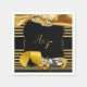 A luxurious shimmering gold silk texture draped through two wedding rings on a dramatic black background with a Deco style stripe to give the design a chic and glamorous look to personalize.with the wedding couple initials.