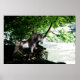 A painting of a black unicorn at a river from his forest edge.