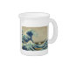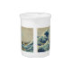 This pitcher features a very famous woodblock print called Kanagawa Okinami-Ura (神奈川沖浪裏), known in English under the name The Great Wave off Kanagawa. It was first printed during the 1830s by an artist named Katsushika Hokusai as a part of his Thirty-Six Views of Mount Fuji series.