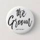 A White button that features the words "The Groom" in an elegant script style text. Underneath this is a spot for a custom name or initials.