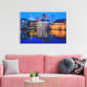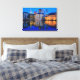 Canvas print of the skyline of the Hague city, the government center of the Netherlands, at the beginning of the evening at Blue Hour with the modern architecture skyscrapers behind historic Mauritshuis museum, Binnenhof parliament building and Hofvijver lake. Great decoration on your wall!