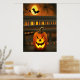 A happy smiling pumpkin standing at a bridge, a dark yellow orange sky in the background with a yellow moon and a bat flying in front of the moon. This is a AI generated art piece