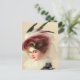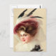 Vintage illustration of a pretty young woman in a rose colored hat decorated with white and black hawk feathers