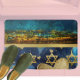 The artwork features a mixed-media design. The upper section displays an oil painting illustration of Jerusalem in Israel at night, separated by a golden ribbon. The lower section includes illustrations in blue hues of hearts and golden stars, referencing the star of David. The overall composition is characterized by elegance and sophistication. Whether using it during Chanukah or for the love of Jerusalem and the Holy Land of Israel any time of the year, this will be a great addition to any decor.