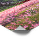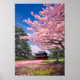 This digital artwork captures the serene beauty of a small wooden Japanese temple sitting in a field of pink flowers, with a stunning cherry blossom tree in the foreground. The tranquil atmosphere and the warm, soft light of the sun create a peaceful and idyllic setting.