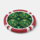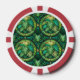 The image shows a poker chip with a vibrant design featuring green ferns and tropical leaves within circular patterns. The chip has a red and white edge.