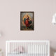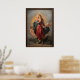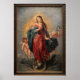 The painting depicts the Virgin Mary elevated above a globe, standing on a crescent moon, symbolizing her purity and divine status. Beneath her feet, a dark sphere contains a serpent, representing evil and original sin, which she triumphantly crushes. Mary’s serene gaze and flowing robes—red symbolizing love and sacrifice, and a blue mantle representing purity—highlight her spiritual grace.