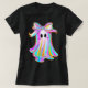 This adorable t-shirt design features a shimmering, iridescent ghost with big, sparkling eyes and rosy cheeks. Draped in a flowing rainbow-hued sheet and topped with a giant pastel bow, the ghost glows with a magical charm. Accented with glittery edges and twinkling stars, it's the perfect blend of cute and spooky—ideal for Halloween or year-round whimsical style!