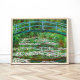 The painting features a pale turquoise footbridge arching over a pond lined with tall grasses and filled with petal-pink and butter-yellow waterlilies spans this horizontal landscape painting.