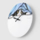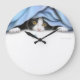 Original fine art design of a young tuxedo kitten stalking a bug by artist Carolyn McFann of Two Purring Cats Studio printed on a quality and customizable wall clock for cat lovers.