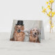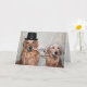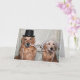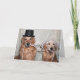 This card shows two golden retrievers dressed as bride and groom. They are each holding an end of a rope which is tying into a heart shaped knot in the middle. This represents the love shared between the married couple.