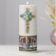 This prayer candle shows a vintage religious postcard reproduction of The Last Supper with Jesus and the Apostles. The postcard was created in the 1930’s from a stained-glass window reproduction of the famous painting by Leonardo da Vinci. Flowers on top with a beautiful flowered cross make it a beautiful candle to light while praying.