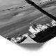 A black & white capture of the London Eye in the background with a classic London building to the right. A sculpture can be seen in the foreground with a dramatic sky overhead
