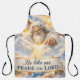 Add a touch of divine inspiration to your kitchen or backyard BBQ with the striking celestial apron the design features a joyful bearded figure with flowing white hair radiating from heavenly clouds accompanied by the uplifting banner be like me praise the Lord this durable and high-quality apron is perfect for church potluck family gatherings or everyday cooking serving as a cheerful reminder of faith and gratitude while you serve other