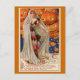 Lovely vintage Halloween card showing a lovely young woman against a background of stars and smiling pumpkins.