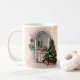 Our old-fashioned Christmas tree by the window at night captures The Magic of Christmas at Home coffee/tea mug.