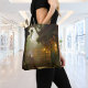 Amazing allover print women's tote bag features a magical bookstore nestled in an enchanted forest, with rows of books and glowing lights among mystical tree branches. Digital painting created using AI generating software. The perfect accessory gift for book lovers!