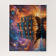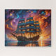 The sun sets on the horizon as a tall ship sails across a glassy sea under a colorful sky of clouds, galaxies, and stars. Beautiful image, perfect for those who enjoy fantasy, sailing, and the sea.