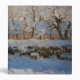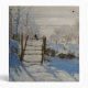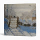 Snowscape painting by the French Impressionist Claude Monet depicting a solitary black magpie perched on a fence.