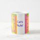 A fun mug for cat lovers, text of "Cats Rule" is written at the center between images. “The Master” cat is loaded with attitude and shows it by wearing a snazzy fuchsia and green striped tie. Tail and nose in the air, this cat is oblivious to the adorable bugs flying around him. Fuchsia paw prints and green dots are tossed randomly on an orange background with the text reading “The Master”. A whimsy multi-color border surrounds the image. “The Master” yellow cat is one of 10 cats from Phyllis Dobb’s “Meow Meow” fabric collection. Customizable.