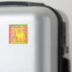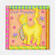 “The Master” cat is loaded with attitude and shows it by wearing a snazzy fuchsia and green striped tie. Tail and nose in the air, this cat is oblivious to the adorable bugs flying around him. Fuchsia paw prints and green dots are tossed randomly on an orange background with the text reading “The Master”. A whimsy multi-color border surrounds the image. “The Master” yellow cat is one of 10 cats from Phyllis Dobb’s “Meow Meow” fabric collection.