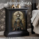 In this captivating decoupage artwork a strikingly masculine anthropomorphic figure dominates the scene. Crafted with meticulous attention to detail, the body exudes a steampunk aesthetic, adorned with brass gears and mechanical components. The most intriguing aspect is the substitution of the head with a skull, symbolizing a fusion of mortality and machinery, creating an enigmatic allure. This piece is a testament to the artist's ability to blend elements of darkness and gothic allure seamlessly. With its male-oriented theme and intricate design, it serves as a captivating focal point for any enthusiast of the dark and mysterious.