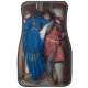 This design features a painting by the Irish Victorian painter Sir Frederic William Burton (1816–1900), who became the third director of the National Gallery in London, England. The painting is inspired by an old Danish ballad, which tells the tragic story of Hellelil, a young noblewoman, and Hildebrand, her bodyguard and secret lover. Burton masterfully depicts the couple in a secret, stolen embrace on a narrow, winding stone staircase. The scene is infused with a sense of urgency and inevitability, as if the lovers know that this moment may be their last. The composition is vertical, with the lovers positioned on a tight spiral of the turret stairs, emphasizing the closeness and the confined space that heightens the emotional intensity of the scene. Hellelil is shown ascending the turret stairs, her head turned slightly towards Hildebrand, who stands above her. She is dressed in a flowing, richly adorned gown of deep blue with golden embroidery, symbolizing her noble status and the formality that constrains her life. Her golden hair cascades in a long pigtail down her back, adding to her ethereal presence. Hellelil's face, illuminated by soft light, is filled with sorrow and a sense of inevitable loss. Hildebrand tenderly clasps her hand between his, as an expression of the deep connection and the desperation of their forbidden love. Hildebrand, who stands below her on the stairs, is clad in a suit of armor, signifying his role as her protector. His face, partially obscured, conveys the melancholy of a man caught between duty and love. The armor also foreshadows the violence and tragedy that will ultimately tear the lovers apart. Despite the constraints of their situation, the lovers' touch is gentle and full of unspoken emotion. The setting of the turret stairs, with its cold, grey stone, contrasts sharply with the warmth of their attire and their shared moment, emphasizing the isolation and the insurmountable barriers they face. The narrowness of the stairwell intensifies the feeling of confinement, as though they are trapped by fate and the rigid social structures of their time. Burton’s delicate use of light highlights the emotional depth of the scene, particularly in the way it gently illuminates Hellelil’s face and their clasped hands. The interplay of light and shadow enhances the mood of the painting, underscoring the bittersweet nature of their farewell. "The Meeting on the Turret Stairs" is a masterful portrayal of doomed love, infused with emotional intensity and narrative richness. Burton's attention to detail, his skillful composition, and his ability to convey the profound emotions of his characters make this painting a timeless depiction of love, loss and the inexorable pull of fate. The original artwork was painted by Frederic William Burton in 1864.