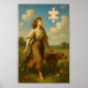 A young woman walks barefoot through a flower-filled meadow, accompanied by a loyal dog by her side. Above her, a puzzle piece shape is cut out of the sky, adding an intriguing element to the serene landscape.