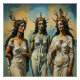 A.I. created surreal print of Three ancient Greek Goddesses know as the Moirai or the 3 Sisters of Fate. They were the personification of destiny - : Clotho (the spinner), Lachesis (the allotter), and Atropos (the inevitable, a metaphor for death), dressed in flowing robes and ornate crowns.